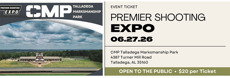 We at the Civilian Marksmanship Program would like to invite you to the CMP Premier Shooting Expo at the CMP Talladega Marksmanship Park. Our staff has worked long hours to put together a marksmanship business gathering that will be the most exciting firearms industry event in the South. The Expo is open to the public and tickets are $40.